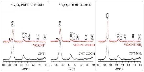 The XRD patterns of the CNTs and the VO/CNT catalysts are shown in Figure 2. The commercial non-functionalized and functionalized CNTs do not show differences corresponding to graphene layers [] with almost no differences in the structure with the functionalization process. The most intense peak at 2θ = 26.3° and 42° corresponds to the graphite hexagonal lattice []. Regarding the VO/CNT catalysts, bulk V2O5 (ICDD ID 01-089-0612) [] is clearly detected at 2θ = 20°, for VO/CNT and VO/CNT-COOH catalysts. Unfortunately, the corresponding peak of VO2 (PDF 01-073-0514) at 2θ = 26.3° and 33.9° [,] is masked with the diffraction peaks of the CNTs. The absence of new diffraction peaks of vanadium species for VO/CNT-NH2 catalyst does not indicate absence of bulk vanadium species since it can be present in a larger dispersion degree and/or inserted in the graphene layers. In the Raman spectra (Figure S3) of the CNTs and the VO/CNT catalysts appears the characteristic D (~1350 cm−1) and G band (~1580 cm−1) [,]. The G band corresponds to the sp2 vibration in the graphitic structure and the D band, the corresponding vibration out of the plane []. An increase in the intensity of the D band indicates structural imperfection and in the G band, a more ordered graphitic structure and the ID″/IG ratio are a descriptor of crystallinity and purity, respectively []. In Table 1, the almost similar ID/IG ratios for the CNTs and the VO/CNT catalysts indicate almost no changes in the graphitic structure by the functionalization and impregnation of vanadium. Choi et al. [], report that ID″/IG values closer to 0.06 correspond to a pure and crystalline (100%) structure and ID″/IG values closer to 0.37, to a total loss of the crystalline structure. In Table 1, the ID″/IG values indicate that the crystallinity structure is maintained for the VO/CNT catalyst, whereas a decrease in the crystalline structure is obtained for the VO/CNT-COOH and VO/CNT-NH2 catalysts. This result is indicative that after the incorporation of vanadium occurs a partial destruction of the CNT structure with the formation of amorphous carbon.