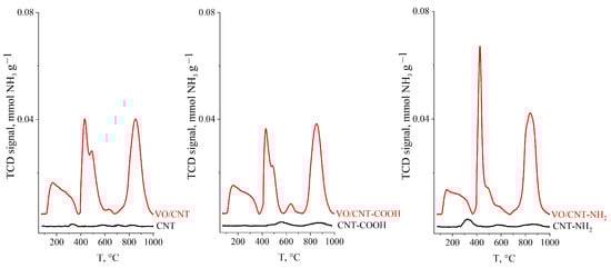 The NH3-TPD desorption classifies the strength of the acid sites into weak acid sites that desorb from 150 °C to 300 °C, medium sites in the range 250 to 400 °C and strong acid sites sites at temperatures >400 °C []. Figure 3 shows NH3-TPD profiles obtained and the total acidity calculated from the area under the desorption profiles is summarized in Table 1. The non-acid CNT is an expected result, and the slight increase for CNT-COOH and CNT-NH2, a consequence of their functionalization process []. The large increases in the total acidity after vanadium impregnation, with almost no dependence with the functionalized group, indicates that the vanadium species have the responsibility of the acid properties of the VO/CNTs catalysts. In this context, Shylesh et al. [] report a total acidity of 1.05 mmol NH3 g−1 for a 15% V2O5/Nd2O5 catalyst with a surface area of 7.2 m2 g−1 []. Therefore the large obtained values (>10 mmol NH3 g−1) of total acidity, shown in Table 1, indicate that the highly dispersed vanadium oxides species are responsible for the acid properties of the synthesized catalysts. However, the non-significant differences in the total acidity values between the catalysts suggest that oxidation of furfural in gas phase cannot be explained from acid properties of the catalysts [].