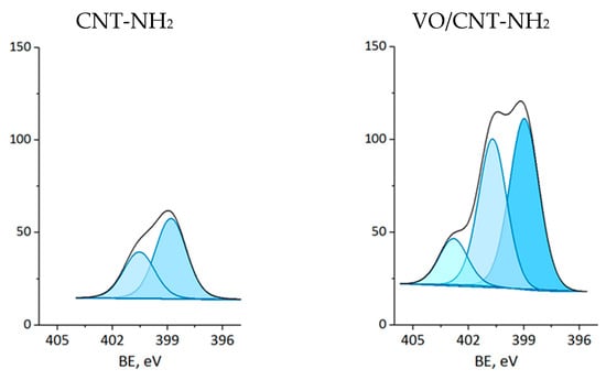 XP spectra of N 1s for CNTs and VO/CNT catalysts (sky blue N-cationic, light blue N-amine and blue N-amide).