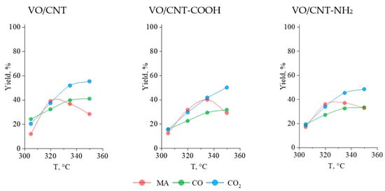 Yield of MA, CO and CO2 for VO/CNT catalysts.