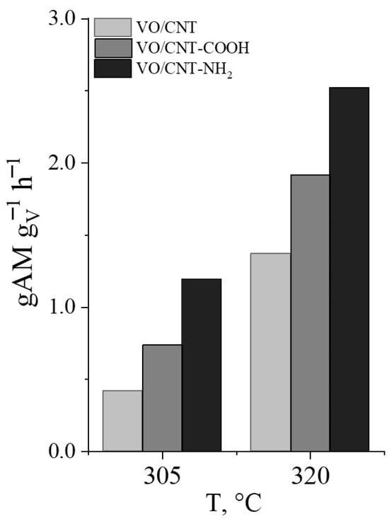 Due to the conversion of furfural being less than 100% at 305 °C and 320 °C, the productivity towards MA can be calculated expressed as g of MA per g of vanadium and time, shown in Figure 8. It can be seen that VO/CNT-NH2 is the more active and selective catalyst to MA productivity, associated with the larger interaction of the VO2 and V2O5 surface active sites with the -NH2 group and enhancing the redox properties and stabilization of vanadium. Furthermore, because XPS indicates that the non-functionalized and functionalized vanadium catalysts display almost the same surface vanadium content, the observed differences in the productivity of MA confirm that the oxidation of furfural not only depends on the oxidizing capacity of VO, but also on the oxygen exchange ability of the support and the vanadium–support interaction.