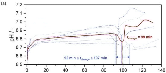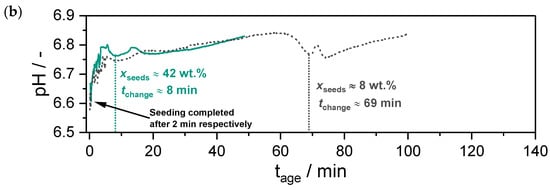 Evolution of pH as a function of the aging time from Guse et al. [46]: (a) seven independent unseeded reference experiments; (b) two seeded experiments with and , respectively.