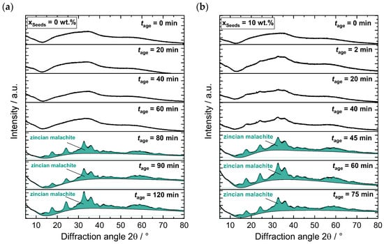 Figure 2 shows the evolution of the X-ray diffractogram as a function of aging time for an exemplary unseeded aging process and for where, respectively, samples were taken approx. every 20 min. When no seeding is applied () all four samples for exhibit an amorphous diffractogram. Simultaneously, the XRF evaluations in Figure 3a show a consistent Zn fraction in the solids throughout the aging process, with no discernible trend. This implies that both Cu and Zn co-precipitate directly ( min) and that no subsequent incorporation of Zn ions from the solution occurs. Instead, a single amorphous Cu/Zn precursor phase (zincian georgeite) or, less probably, several amorphous precursor phases must form in the early stages of aging, which is compatible with the findings reported in the literature [34,48,65]. The first crystalline structures appear in the 80-min sample, indicating the beginning of the transformation from zincian georgeite to zincian malachite [27,36]. However, the evaluation of in Figure 3a indicates substantial uncertainty up to 100 min, showing that a change in crystal structure is ongoing and that a high fraction of amorphous solids is still present. After the phase shift, which is indicated by the pH minimum in Figure 1a and a color change, consistently high Zn fractions in the predicted range of are prevalent in Figure 3a. In general, the total Zn fractions obtained from ICP-OES and XRF are between and , which corresponds to the expected value of . The Rietveld refinement (cf. Section 2.2.1) verified the presence of minor amounts of Zn-rich aurichalcite or hydrozincite () in addition to zincian malachite at .