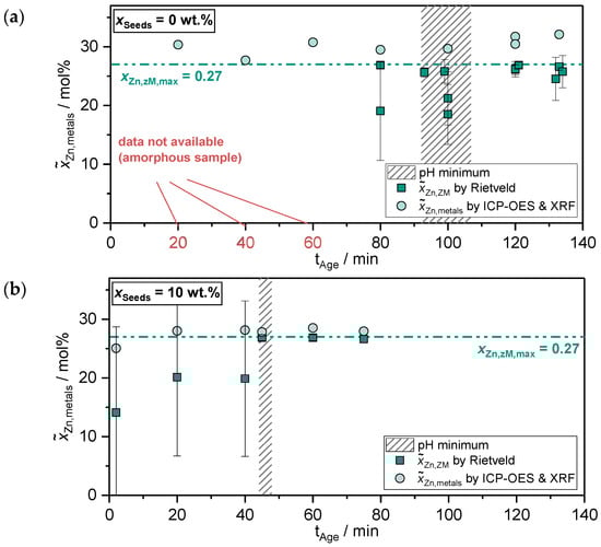 If seeds are added after precipitation is completed at (), weakly noticeable peaks are present in the foremost amorphous diffractogram for in Figure 2b. For such low values, the solid phase for consists of only a very limited amount of crystalline material, mostly freshly precipitated amorphous precursor, which explains the mostly amorphous diffractogram. Accordingly, for aging times below the necessary phase change time established by the pH minimum, there are some deviations for from the target of and for from , similar to the unseeded cases shown in Figure 3b. Again, in the solid phase is constant over the aging time, implying that the phase transformation proceeds by the restructuring of an amorphous Cu/Zn-based solid phase. On the basis of the FT-IR analysis (cf. the Supplementary Materials) and the literature [36,51], zincian georgeite is the most probable phase. After the phase change at , all further samples show and . This confirms that seeding accelerates the induction time until the phase change to zincian malachite takes place () and, consequently, accelerates the whole aging process significantly.