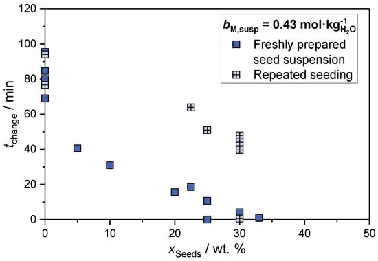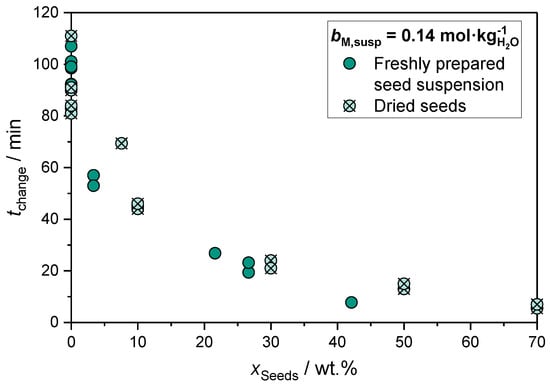 The effect of seeding on the necessary aging time was investigated for a low concentrated suspension (cf. Section 2.1.1) and a high concentrated suspension (). In the case of a high concentration, the metal salt molality in feed 2 was set to in order to evaluate if the findings were transferable to more industrially relevant solids concentrations. In Figure 5, the correlation between the seed mass fraction and the necessary aging time required until phase change is completed ) has been plotted for experiments using freshly prepared seed suspension. Furthermore, the effect of repeated seeding steps with a focus on a continuously operated aging step was also investigated. For this purpose, a defined amount of the aged suspension was maintained in the reactor after aging was completed in a first run and was further used as the seed suspension for a subsequent aging process. This procedure was then repeated up to five times.