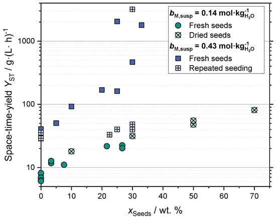 The most significant improvement is evident for and , where the space-time-yield is increased by a factor of up to 60. Here, space-time-yields of more than 2 kg of aged precursor material per hour and liter reactor volume were achieved. When seeding is conducted repeatedly, decreases in accordance with the results discussed above but remains 5% larger than it would be without seeding. In one exceptional case, the high was maintained for reasons that are not yet understood. For the usage of dried seeds at the space-time-yield was reproducibly increased by a factor of 12 for the highest seed mass fraction applied, making it a reliable alternative to the use of fresh seed suspension, where a similar increase in the space-time-yield is achieved. In summary, the vast reduction of necessary aging time when seeding is applied at low concentrations has also been confirmed for concentrated reactant solutions (), where the impact on the space-time-yield is even higher.