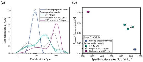 As stated previously, the impact of seeding is, in general, attributed to the total available surface area of the seeds [66,67]. The effective surface area of the seeds dispersed in the suspension can only be estimated, for instance, based on dynamic light scattering (DLS) measurements, as shown in Figure 7b, or by BET analysis of the dried material. Thus, we mainly use the seed mass fraction to quantify our results but have confirmed with DLS studies that the particle size distributions (PSD) of the applied seed particles are identical in each study. In Figure 7a, the PSD and standard deviations of the freshly prepared seed suspensions (“freshly prepared seeds”), as well as the PSD and deviations of the dried, fractionated and then resuspended seeds (“x < 40 µm”), are compared. Additionally, the PSD of two larger-sized fractions of dried and resuspended seeds are investigated.