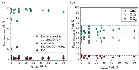 After aging, zincian malachite is the main crystalline phase with mass fractions of, in general, independent of . The two outliers are the result of insufficient temperature control, resulting in . Aurichalcite is the second main crystalline phase, with due to the high Zn fractions of in the metal composition of the reactants. According to the Rietveld refinement, ZrO2 has mass fractions of due to the reduced molar mass compared to the other two phases. The independence of the phase composition from confirms that the aging parameters and reactant ratios were chosen correctly and, more importantly, that despite reduced aging times, seeding does not affect the phase composition. This conclusion is confirmed by the analysis of the calcined material shown in Figure 8b where, again, no correlation between the phase composition and the seed mass fraction is evident. The higher fluctuation in the mass fractions determined by Rietveld refinement results from the overlap of the phase-specific diffraction patterns (cf. the Supplementary Materials).
