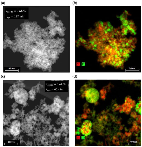 The TEM-EDXS evaluation on the right indicates that these spheres are composed of CuO alone, with minuscule traces of ZnO. Furthermore, multiple clusters of ZnO where are present. These inhomogeneities indicate that the formation of zincian malachite during aging, as a prerequisite for homogeneous Cu/Zn distribution [36], was not complete at the time of sampling. The evolution of the X-ray diffractogram during the unseeded aging shown in Figure 2 confirms this assumption. In contrast, for both the unseeded and the seeded samples, the aging time exceeded the necessary phase change time . As a result, the homogeneous distribution of Cu and Zn is present for these two samples, confirming, first, the necessity of forming zincian malachite during aging, and second, the importance of seeding to reduce the necessary aging time while maintaining the product specifications. The Zr distribution depicted in the Supplementary Materials (Figure S5) shows no deviating trends and is, therefore, not separately discussed here.