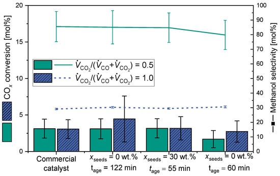 In contrast, the conversion of CO and CO2 behave similarly to the methanol productivity shown in Figure 10: for both feed gas compositions, the conversion is similar for the commercial catalyst and for both catalysts prepared with a sufficiently long aging time. The increased COx conversion of the unseeded catalyst for / most probably results from some fluctuation in the measurements, as indicated by the increased standard deviations compared to the other samples. These fluctuations are explainable by slight condensation after the reactor outlet [76]. However, for the unseeded catalyst with a reduced aging time, the COx conversion is decreased by approx. 45% and 12%, respectively. This trend explains the decreased methanol productivity of the catalyst in Figure 10.