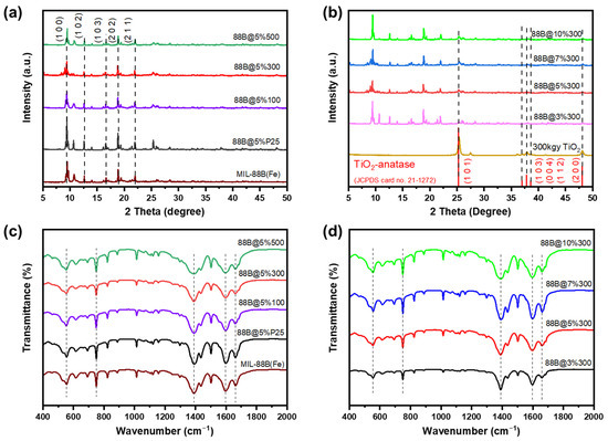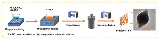A simple hydrothermal measure was used to create the catalyst (Figure 8). Firstly, 2.3 mmol FeCl3·6H2O and 2.3 mmol terephthalic acid (H2BDC) were mixed in 50 mL DMF for 30 min. Then, an appropriate amount of treated TiO2 powder was added to the above suspension and sonicated for 30 min. After stirring, the solution was heated at 145 °C for 12 h. The brown suspension was washed with MeOH and DMF three times, then vacuum-dried at 70 °C for 12 h to obtain the sample. TiO2 was added at X% (X = 3, 5, 7, 10%) of the yield of MIL-88B(Fe), which was prepared in the same manner, and the sample was designated as 88B@X%YYY (Y = 0, 100, 300, 500 kGy is the irradiation dose of TiO2).