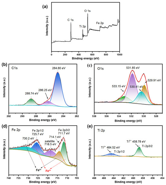 XPS of 88B@5%300: (a) survey, (b) C 1 s, (c) O 1 s, (d) Fe 2 p, (e) Ti 2 p.