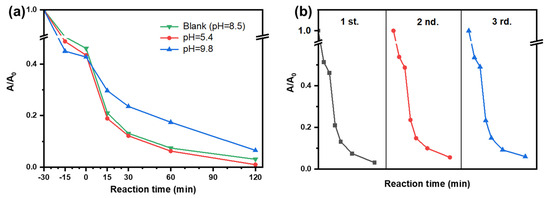 Nevertheless, the TC removal was lower than the reaction in natural nature at the end. This might be caused by excessive OH− scavenging the radical [39]. The result also indicated that the material is able to withstand a range of pH changes while preserving a high degree of degradation (>94%). Meanwhile, in the recycling experiment (Figure 5b), the material retains a favorable catalytic performance after three cycles.