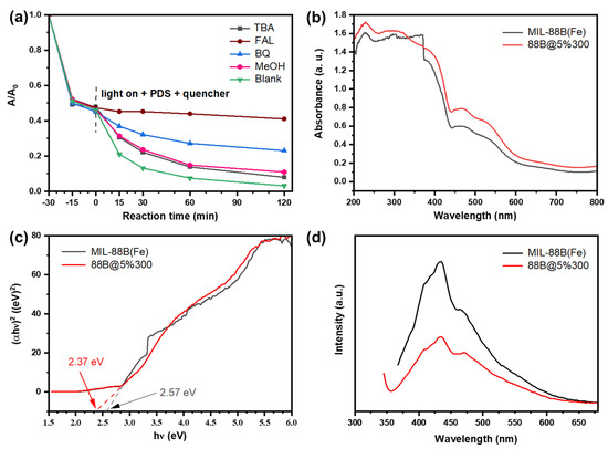 (a) Results of quenching experiments, and (b) UV–vis DRS spectrum, (c) Tauc-Plot, (d) PL spectra of 88B@5%300 and MIL-88B (reaction condition: [88B@5%300]0 = 5 mg, [PDS]0 = 500 ppm]).