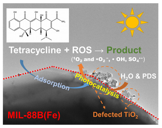 Meanwhile, growing photo-active materials on metal organic frameworks (MOFs) is also a promising approach to improving the catalytic performance. In this way, the organic skeleton of MOFs could be utilized to transfer electrons, which effectively inhibits the recombination of photogenerated carriers [18]. MIL-88B(Fe), as one of the typical Fe(III)-based MOFs, is visible-light-sensitive, environmentally friendly, non-toxic, and cost-effective. Moreover, in sulfate radical-based photocatalysis, MIL-88B(Fe) could cycle between Fe(III)-O and Fe(II)-O to generate persulfate radicals from persulfate efficiently. In general, the preparation of defective TiO2 and the construction of heterojunctions with Fe-MOFs is an effective way to improve the catalytic performance.