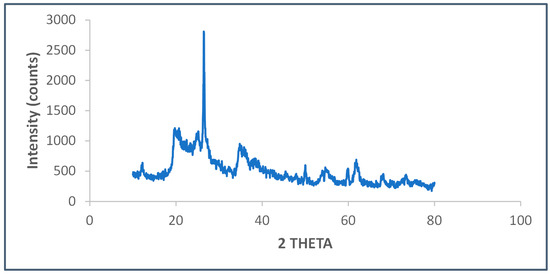 The oldest and most widely used technique for characterizing catalysts is thought to be X-ray diffraction. Lattice structural parameters are used to identify the crystalline phase within catalysts and to determine the size of the particles. The X-ray diffraction instrument used in this study was capable of generating Ni-filtered cuK radiation with a wavelength of 1.5418 Å. The instrument operated at 40 kV and 30 mA during the XRD measurements of the catalyst samples. The diffraction patterns were recorded over a 2θ angular range of 3° to 60°. X-ray diffraction is a well-established technique that can distinguish materials based on their characteristic diffraction patterns, with a scanning rate of 5°/min. It offers statistics on how far a specific structure deviates from the overall structure, in addition to section identification. High-resolution X-ray diffraction was used to record the crystal structure of the particles. Additionally, the presence of an amorphous silica component was confirmed by a large diffraction peak at 2 = 20°–24° [11]. The clearly defined nano-silica diffraction peak revealed the hypothesized existence of a highly structured hexagonal mesostructure. Figure 1 below illustrates the XRD for amorphous nano-silica.