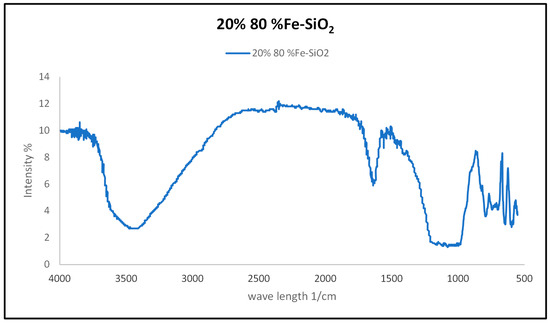 Spectroscopic investigation provided unequivocal evidence that the mesopore walls were made of a zeolite-like structure [12,13,14]. The scientific literature frequently cites bands in the range of 550 to 600 cm−1 when investigating materials containing MFI-type and zeolite β seed structures. These bands are believed to correspond to the asymmetric stretching vibration of the 5-membered ring components within the material’s framework. The tetrahedral coordination of Al is a further intriguing characteristic of the aluminosilicate phase. This is significant because it emphasizes the existence of a potent Bronsted acid center of the zeolite variety, which is useful for research as a microporous material, particularly as a possible heterogeneous catalyst [13,14,15,16,17]. Figure 3 shows the results of the produced catalyst’s FTIR examination.