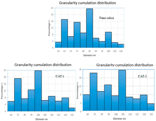 The connection between an assumed particle dimension and the frequency of that size or diameter is known as “particle size distribution”. Atomic Force Microscopy (AFM) is conducted by ethanol dispersion to measure the particle size distribution. The basis of this discussion rests on the perceived notion that the majority of particles exhibit remarkably similar shapes. It is crucial, when evaluating the catalytic properties of metal-backed catalysts, to account for the actual sizes and distributions of the particles. The physical dimensions of the metal particles determine their surface area, and consequently the potential number of active sites, as well as the electrical characteristics of the metal, which are dependent on particle size. Even though such catalysts may share similar average particle sizes, the distributions of particle extents can vary dramatically, and the characteristics of the compared catalysts may differ significantly as a result. Figure 5 explains the particle size distributions of nano-silica and the produced catalysts.