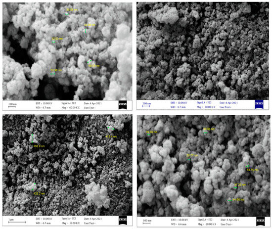 The SiO2 nanocatalyst’s surface shape and real particle size were visible in SEM, in large part due to the catalyst’s enormous surface area and mesoporous frequencies functioning as beds and supports. This technique was utilized using a Zeiss-EM10C-100KV FESEM device (Oberkochen, Germany). Figure 6 below displays a SEM picture of the nano-silica.