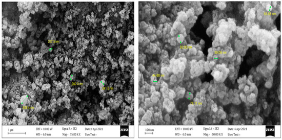 The bimetal nanocatalyst’s (Fe3O4/SiO2) surface shape and particle size were demonstrated by FESEM. SiO2 acted as a couch support for Fe3O4 and zeolite due to its variable surface and mesoporous frequencies. As seen in the image, several forms of iron were immobilized on a mesoporous silica surface. The SEM image of the catalyst (Fe/nano-silica) created in our work is given in Figure 8 below. Additionally, the micrographs (magnification of 1 m) demonstrate a uniform 100 distribution of the active metal (Fe) on the catalyst’s surface along with the presence of spherical particles and well-developed pores.