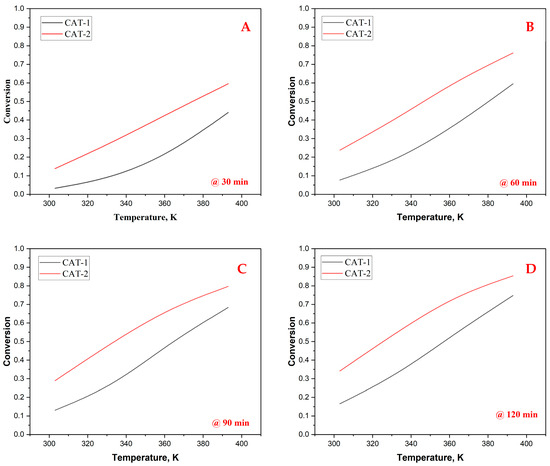 This study investigated an oxidation reaction at various time intervals, including 30 min, 60 min, 90 min, and 120 min. The results were presented graphically, and it was observed that the experimental findings for different temperatures were unique for each catalyst. In all cases, the desulfurization efficiency increased as the reaction time was extended, as a longer reaction time allowed for enhanced contact between the reactants. The interpretation of the figures can be summarized as follows: Figure 11A indicates that an increase in reaction time led to an increase in the conversion rate. With extended reaction time, the reactants had more opportunity to interact with the active sites of the catalyst, thereby enhancing the overall interaction process [23,24,25]. For instance, by simply increasing the reaction time from 30 min to 120 min at 303 K, the conversion of sulfur compounds rose from 33% to 79.83%. Images presenting the obtained results are provided in Figure 11 below.