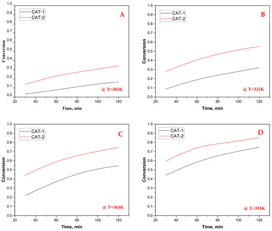 Effect of reaction time for different catalyst types on the sulfur conversion at various reaction temperatures. Effect of reaction time on sulfur conversion at different temperatures: (A) 303 K, (B) 333 K, (C) 363 K, (D) 393 K.