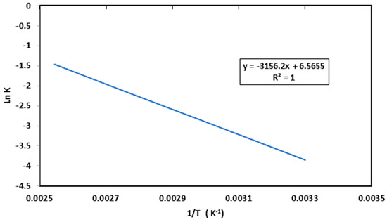 Figure 12 and Figure 13 depict the Arrhenius equation, which was used to determine the activation energy for each catalyst by plotting (lnk) vs (1/T) and finding that the slope of the line is equal to (−E/R). Table 6 displays the calculated activation energies.