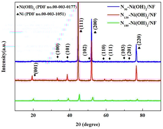 The crystal structures of the as-prepared samples were characterized by XRD, and the corresponding XRD patterns are shown in Figure 2. For NF-supported samples, the characteristic peaks of metallic Ni (PDF no. 00-003-1051) can be detected at 44.8°, 52.2° and 76.8° []. Except for the peaks of metallic Ni and test substrate, the detection results for the other peaks are very weak in the N90-Ni(OH)2/NF sample, indicating that Ni(OH)2 formed at 90 °C has a low crystallinity. However, all peaks detected for Ni(OH)2 can be well-indexed to pristine β-Ni(OH)2 (PDF no. 00-003-0177) in the samples of N130-Ni(OH)2/NF and N180-Ni(OH)2/NF [,], which is due to the surface chemical reaction between Ni and water vapor at high temperatures.