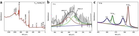 To further confirm the composition of the obtained catalysts, the detailed chemical structures and elemental oxidation states of as-prepared N130-Ni(OH)2/NF were characterized by XPS (Figure 3). The XPS survey (Figure 3a) demonstrated the existence of Ni, O and N elements in N130-Ni(OH)2/NF. The XPS spectrum of N 1s (Figure 3b) deconvolved into two distinct peaks at 398.5 eV and 400.0 eV, respectively. This indicates strong and weak interactions between Ni and N in the sample, respectively, thus revealing the successful doping of the N atoms in the samples. In the Ni 2p region (Figure 3c), Ni 2p 1/2 (873.2 eV) and Ni 2p 3/2 (855.7 eV) are assigned to Ni(OH)2, which proves that the metallic Ni species transform into metal hydroxides after ammonia vapor-phase hydrothermal treatment [,]. Combined with the XRD spectrum, it was confirmed that the nickel hydroxide on the surface of the catalyst was mainly β-Ni(OH)2 crystal, which proved the successful synthesis of the N-Ni(OH)2/NF catalyst. Furthermore, the energy-dispersive X-ray (EDX) spectra and element mapping results of the N130-Ni(OH)2/NF catalyst also confirmed the successful introduction of N atoms into Ni(OH)2, and all the elements were dispersed uniformly on the material surface (Figure S1). All the above results confirm the incorporation of N species into the nanosheet structure of Ni(OH)2.