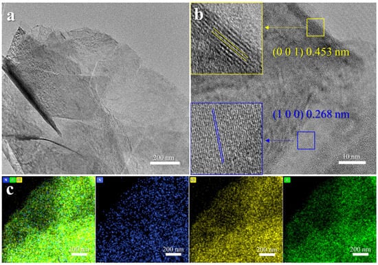 The transmission electron microscope (TEM) images show that N130-Ni(OH)2/NF presented with thin layers of nanosheets (Figure 5a), which is consistent with the SEM images above. In the high-resolution TEM (HRTEM) image of N130-Ni(OH)2/NF, we observed lattice fringes attributed to Ni(OH)2 0 0 1 (0.453 nm) and 1 0 0 (0.268 nm) crystal faces, respectively (Figure 5b). The above results proved that Ni(OH)2 was successfully prepared by the rapid low-temperature ammonification process. As shown in Figure 5c, the TEM mapping image shows that there are uniformly distributed N elements in the structure of N130-Ni(OH)2/NF, which indicates that we have successfully implemented the N-doping process. The EDS mapping image shows that the content of N element in N130-Ni(OH)2/NF is 3.1% (atomic fraction). With the increase in synthesis temperature, the amount of N-doping increases gradually. At 130 ℃, we achieved the most suitable N-doping amount and the most ideal morphology construction. The doped N element had a significant effect on the catalytic activity. The doping of N element is too small to cause obvious lattice distortion and electronic structure disturbance. If the N element is doped too much, the H adsorption capacity of the Ni active site will be weakened, and the activity will be reduced. Therefore, the amount of N doping needs to be regulated in a suitable range. The decomposition of ammonia and the growth rate of Ni(OH)2 can be affected by temperature control, so the amount of the N doping can be easily controlled.
