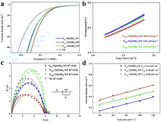 As shown in Figure 6, the HER electrocatalytic performances of all obtained samples were tested in 1.0 M KOH using bare NF as a reference. The current density measured at the applied potential is one of the key parameters for electrocatalysts, which reflects the catalytic activity of corresponding electrodes. In the polarization curves in Figure 5a, the results of the LSV indicate that the performance of bare NF as a HER catalyst is not ideal. The overpotential of bare NF achieved at 10 mA cm−2 is 270 mV, suggesting its low activity towards HERs in this potential region. For N-modified Ni(OH)2/NF, the improved HER performances are shown with a lower overpotential to deliver 10 mA cm−2.