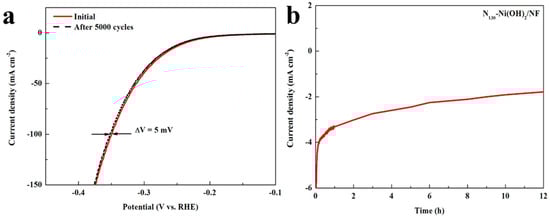 In Figure 8a, the LSV curve results show that the potential drop at 100 mA cm−2 does not exceed 5 mV after 5000 cycles. To further examine the stability of the electrode during the electrocatalysis process, a chronoamperometry (CA) test was continuously performed for 12 h at −1.3 V (vs. SCE); the corresponding potential-time curve is shown in Figure 8b. The results show that the current density of N130-Ni(OH)2/NF exhibits only faint degradation even after an operation of 12 h. Detailed electrochemical tests and physical characterization were performed on the samples after 12 h stability tests. After 12 h, N130-Ni(OH)2/NF showed no significant decrease in HER activity (Figure S5a). At the same time, SEM images show that the nanosheet morphology is well-maintained (Figure S5b). An obvious uniform distribution of N elements can still be observed in the TEM mapping images (Figure S5c), proving that doped N elements can be stable in the structure. The above results provide conclusive evidence that N130-Ni(OH)2/NF is exceptionally stable during long-term electrolysis.