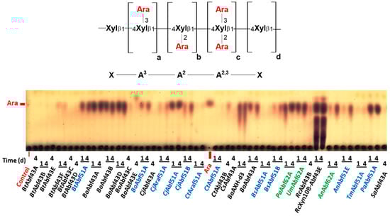 TLC analysis of wheat arabinoxylan (WAX) hydrolysates. A schematic structure of the polysaccharide in non-abbreviated and abbreviated forms is shown above the TLC plate. The plate was developed in the solvent system of 1-butanol/ethanol/water (10:8:5, by vol.; system 1), and the sugars were visualized using orcinol detection reagent. The GH43, GH51, and GH62 enzymes are marked in black, blue, and green colours, respectively. Aliquots of the reaction mixtures were spotted after 1 and/or 4 days of incubation.