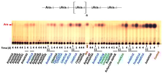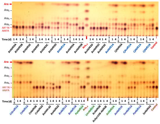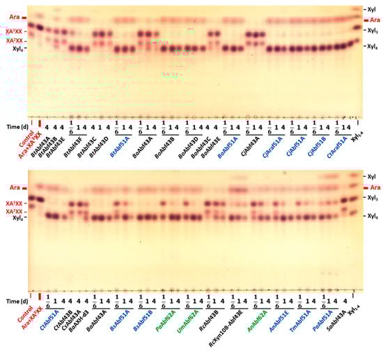 All 12 examined proteins from the GH51 family attacked 1,5- as well as 1,2- and 1,3-linkages. Accordingly, the enzymes were active on all arabinoxylan- and arabinan-derived polysaccharides and oligosaccharides except those comprising internally 2,3-diarabinosylated residues. Interestingly, the majority of the enzymes were able to liberate arabinose from the xylooligosaccharide doubly arabinosylated at the non-reducing end (A2,3XX). With a few exceptions, all our findings are in accordance with the literature data about these enzymes [,,,,,,,] which were generally reported to exhibit broad specificity, being active on both arabinoxylan- and arabinan-based substrates and/or exhibiting both main chains as well as debranching activity towards branched arabinan. However, none of the enzymes have previously been tested on such a large set of oligosaccharide and polysaccharide substrates as was used in this study. Despite the wide spectrum of the investigated substrates, we found no significant difference in the substrate and positional specificity between the studied members of the GH51_1 and GH51_2 subfamilies. The differences were insignificant also in case of AG, from which BsAbf51A, BtAbf51A, BoAbf51A, PaAbf51A, AnAbf51E, and CjAbf51A were found to unambiguously liberate arabinose. Such a capacity is shown here for the first time for the latter five enzymes. Generally, the dearabinosylation of larchwood AG has hitherto been studied very rarely because there are only few reports in this regard. This polysaccharide has previously been included in the tested substrates only in the case of BsAbf51A (positive result), BsAbf51B, and TmAbf51A (negative result) [,,].