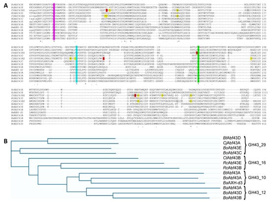 The amino acid sequences of the enzymes belonging to those GH43 subfamilies, which were represented by multiple members in this study (GH43_10, GH43_12, GH43_16 and GH43_29), were compared. All sequences were analyzed for the presence of a signal sequence using the server of SignalP, version 6.0 (https://services.healthtech.dtu.dk/services/SignalP-6.0/, accessed on 14 July 2024). If the signal sequence was predicted, it is indicated by small letters in Figure 3A. Only GH43 catalytic domains were included in the multiple sequence alignment, which was generated by Uniprot server (https://www.uniprot.org/align, accessed on 14 July 2024). Simultaneously with the multiple sequence alignment, the phylogenetic tree (Figure 3B) and percent identity matrix table (Supplementary Table S1) were obtained.