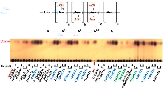 TLC analysis of sugar beet arabinan (SBA) hydrolysates. Schematic structure of the polysaccharide in non-abbreviated and abbreviated forms is shown above the TLC plate. The plate was developed in the solvent system of 1-butanol/ethanol/water (10:8:5, by vol.; system 1), and the sugars were visualized using orcinol detection reagent. The GH43, GH51, and GH62 enzymes are marked in black, blue, and green colours, respectively. Aliquots of the reaction mixtures were spotted after 1 and/or 4 days of incubation.