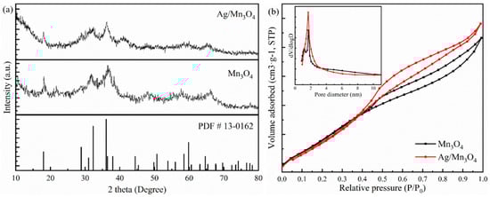 The XRD patterns and N2 adsorption/desorption isotherms and pore size distributions are shown in Figure 1. From Figure 1a, the Mn3O4, Ag/Mn3O4 somewhat showed the same XRD patterns as standard cubic Mn3O4 (PDF # 18-0803) according to the analysis results of Jade 6.5, indicating that Ag doping did not change the crystal phase of manganese oxide. In addition, the diffraction peaks assigned to Ag or Ag2O could hardly be observed, indicating the high dispersion of Ag in Mn3O4 [].
