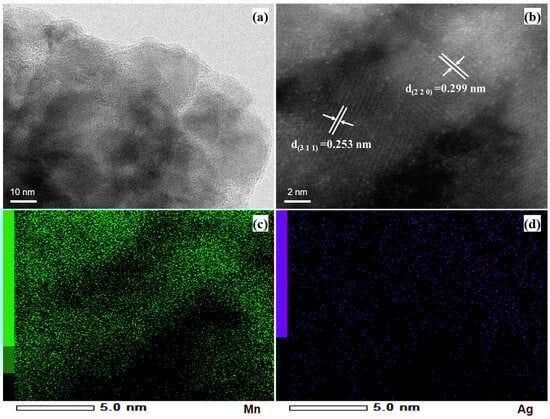 Figure 2 shows the high-resolution TEM (HRTEM) image and high-angle annular dark-field STEM images of Ag/Mn3O4, respectively. As shown in Figure 2b, the interplanar spacings were 0.299 nm and 0.253 nm, which were very close to the (2 2 0) and (3 1 1) crystal planes of Mn3O4 (PDF # 13-0162), respectively. Furthermore, the dispersion of Ag was uniform, without any agglomeration, as shown in Figure 2b,d, which was in somewhat of an agreement with the XRD results in Table 1. Summary of BJH parameters of Mn3O4 and Ag/Mn3O4.