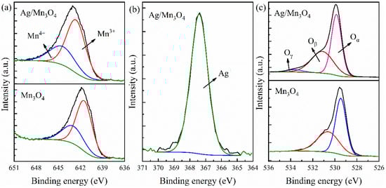 XPS curves of Mn3O4 and Ag/Mn3O4 ((a): Mn 2p 3/2; (b): Ag 2d 5/2; and (c): O 1 s).