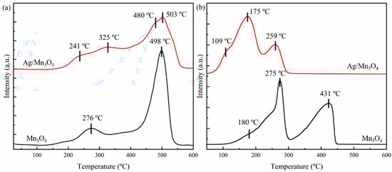 The evolution of the surface oxygen species of the two catalysts was investigated by the O2-TPD technique, and the results are shown in Figure 4a. In general, the desorption of adsorbed oxygen species occurred at temperatures ranging from 200 to 400 °C, while the surface lattice oxygen species usually desorbed at temperatures ranging from 400 to 600 °C [,]. For the Mn3O4 sample, the peak centered at 276 and 498 °C should represent the desorption of adsorbed oxygen species and lattice oxygen species, respectively. In comparison, the desorption peak of adsorbed oxygen species from Ag/Mn3O4 at 325 °C, with an obvious shoulder at 241 °C, indicated that the introduction of Ag into Mn3O4 resulted in surface oxygen species with a higher reactivity. It is widely accepted that active surface oxygen species would not only generate unsaturated chemical bonds but also lead to unbalanced charges, which would ultimately make the decomposition of ozone as well as the redox reactions occur more easily [,]. Since the surface oxygen species of Ag/Mn3O4 showed a higher activity than that of Mn3O4, the former sample would exert a better catalytic performance in the OCO of benzene.