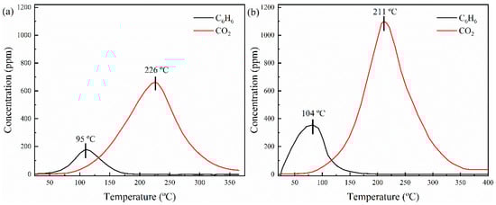 To illustrate the activity of surface oxygen species and the adsorption/desorption behavior of benzene on the as-prepared catalysts, the C6H6-TPSR technique was introduced, and the profiles are shown in Figure 5.