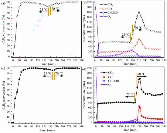 When the temperature was increased to 70 °C, the benzene conversion rates recovered rapidly to nearly 100%, and no deactivation was observed in the last 70 min (Figure 6a,c). Moreover, the elevated temperature also favored the production of CO2 and CO, which showed a sharp increase in the first 30 min and then decreased to stable, normal values. The sharp peaks for both CO2 and CO were attributed to the oxidation of some organic intermediates simulated in the catalytic oxidation of benzene at 25 °C []. The benzene mineralization percentage for both samples at 70 °C in the last 60 min was very close to 100%, according to the data in Table 3, but Ag/Mn3O4 also showed higher CO2 production and lower CO generation than Mn3O4. Meanwhile, nearly no O3 could be detected in the outlet, further demonstrating that the two samples exerted a satisfying catalytic performance at 70 °C.