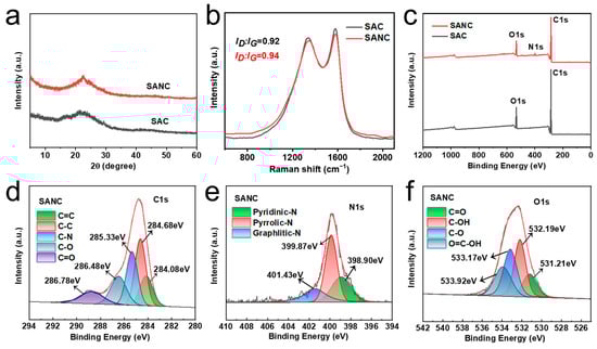 (a) XRD of SAC and SANC; (b) Raman spectra of SAC and SANC; (c) XPS spectra of SAC and SANC; (d–f) high-resolution C 1 s, N1s, and O 1 s spectra of SANC.
