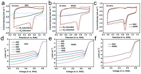 (a,b) CV curves of SAC and SANC in 0.1 M KOH electrolyte with N2 and O2 saturation at a scanning rate of 10 mV s−1; (c) comparison of CV curves for SAC and SANC in 0.1 M KOH electrolyte with O2 saturation at a scanning rate of 10 mV s−1; (d,e) LSV curves of SAC and SANC in 0.1 M KOH electrolyte with O2 saturation at different rotation rates from 400 to 1600 rpm; (f) comparison of LSV curves for SAC and SANC in 0.1 M KOH electrolyte with O2 saturation at 1600 rpm.