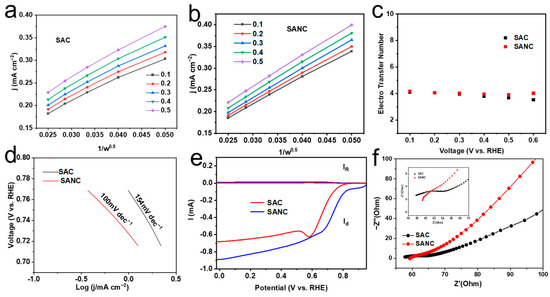 (a,b) Koutecky−Levich plots of SAC and SANC under different applied potentials; (c) electron transfer numbers of SAC and SANC; (d) Tafel slope diagrams of SAC and SANC; (e) RRDE voltammograms for SAC and SANC with O2-saturated 0.1 M KOH solution at 1600 rpm at a scanning rate of 10 mV s−1; (f) electrochemical impedance spectra of SAC and SANC.