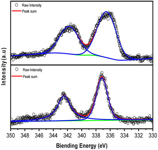 To further study the surface oxidation of the Pd element, X-ray photoelectron spectroscopy (XPS) was performed on both fresh and spent samples (Figure 3). Figure 3 displays the XPS spectra for the Pd 3d region of both fresh and spent Pd/Al2O3 catalysts, including the fitting results for these signals. X-ray photoelectron spectroscopy (XPS) was conducted on both the fresh and spent samples to investigate the surface oxidation state of Pd. The spectra in Figure 3 reveal positive shifts in binding energies, which indicate partial oxidation of Pd to PdO, a finding that aligns with the results from X-ray diffraction (XRD) [29]. The partial oxidation of Pd can also be observed from the shift in binding energy, which further demonstrates the consistency of the XRD and STEM results.