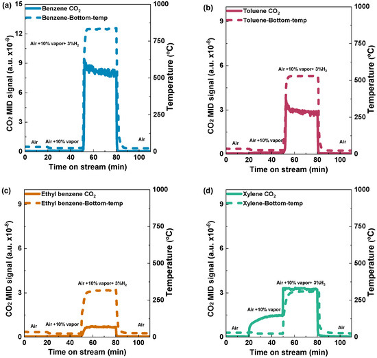 Overall, it can be seen that the preheating temperature achieved with 2% hydrogen is below the respective light-off temperatures of benzene (180 °C), toluene (250 °C), ethyl benzene, and xylene (250 °C). Consequently, the initiation of oxidation for these volatile organic compounds is effectively catalyzed through hydrogen co-combustion. Each experiment followed a well-structured protocol to ensure accurate initiation and precise combustion process monitoring. The stability of temperature and CO2 levels confirmed steady-state conditions, and the system returned to baseline values after air was introduced, indicating the successful completion of the catalytic reaction. The same trend was observed for all other aromatic VOCs. These studies demonstrated that hydrogen has the potential to be an efficient enhancer for the catalytic combustion of VOCs [33].