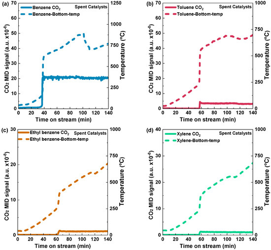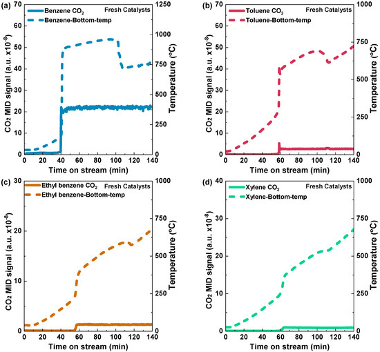 Light-off curves illustrated by CO2 formation and catalyst bed temperature raising profiles during the temperature-programed reactions of (a) benzene, (b) toluene, (c) ethyl benzene, and (d) xylene over spent Pd/Al2O3 catalyst using an electric heating furnace. Condition: 0.5 g catalyst; VOC concentration: 10% vapor; Temperature: 0–725 °C: 5 °C min−1, and Total flow rate: 1000 mL min−1 (GHSV: 120,000 mL h−1·g−1).
