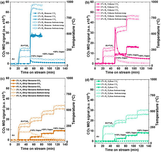 Furthermore, to investigate the impact of hydrogen gas on the aromatic volatile organic compounds (VOCs), various quantities of hydrogen gas (specifically, 2%, 3%, and 4%) were employed, as depicted in Figure 7. The evolution profiles of catalyst bed temperatures and CO2 signals with co-feeding of H2 and VOCs are shown in Figure 7a–d. In all experiments, the background CO2 signals could be obtained within the initial 20 min of airflow at a rate of 1000 mL/min. Initially, the effect of 2% H2 was studied for benzene with 10%, 20%, and 30% of VOCs, and the temperature gradually dropped towards room temperature from the initial 10% concentration insertion to the last 30% insertion. The CO2 signal intensities in stepwise mode also declined at the same time. The unexpected reduction in temperature with increasing benzene content may be attributed to insufficient surface coverage and hydrogen ignition. The presence of these variables may hinder the desired exothermic process, leading to the observed reduction in temperature instead of the anticipated increase. A similar pattern was observed for the other VOCs, including toluene, ethylbenzene, and xylene.