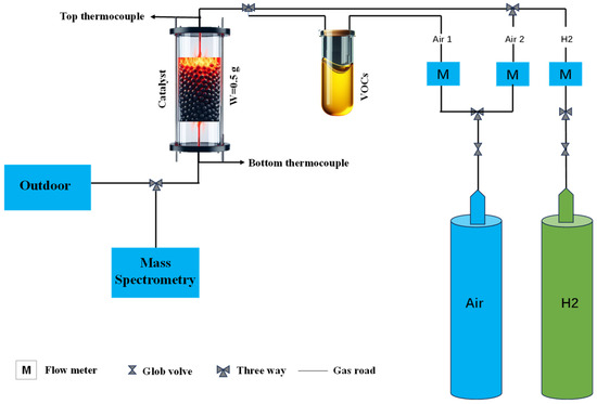 The fixed-bed reactor consisted of a quartz tube 30 cm in length and 10 mm in inner diameter. In the center of the quartz tube, 0.5 g of Pd/Al2O3 catalyst with a volume of 0.78 cm3 was supported by 200 mesh ceramic honeycombs. Scheme 1 shows the packing specifications for the k-type thermocouple used to measure the temperature inside the catalyst bed. The typical molecules for aromatic compounds were determined to be benzene, toluene, ethyl benzene, and xylene. By bubbling the chemical vapors (benzene 99.7%, toluene 99.7%, ethyl benzene 99.7%, and xylene 99.7%; Tianjin Fuyu Fine Chemicals) at flow rates of 100, 200, and 300 mL/min, respectively, VOC emissions were replicated. In light of this, the vapor concentrations in a 1000 mL/min total flow were designated as 10%, 20%, and 30% vapor, respectively (for details, please see Table 1). Hydrogen was supplied from a high-purity hydrogen generator (Beijing Zhonghuipu, SPH-300A, Beijing, China). The flow rates of air and H2 were controlled by calibrated mass flow controllers, and the total flow rate was maintained at 1000 mL/min, i.e., giving an hourly gas space velocity of 120,000 mL/g-h or 77,000 h−1. The reactants and products were analyzed and recorded using a Hiden Analytical mass spectrometer (HPR-20, R&D) (Warrington, UK) by monitoring the signals of H2 (m/z = 2), benzene (m/z = 78), toluene (m/z = 91), ethyl benzene (m/z = 91), xylene (m/z = 91), and CO2 (m/z = 44). Temperature-programed catalytic reactions of VOCs and air over Pd/Al2O3 were conducted to identify the light-off temperatures using an electric heating furnace at a ramp rate of 5 °C/min from room temperature to 750 °C.